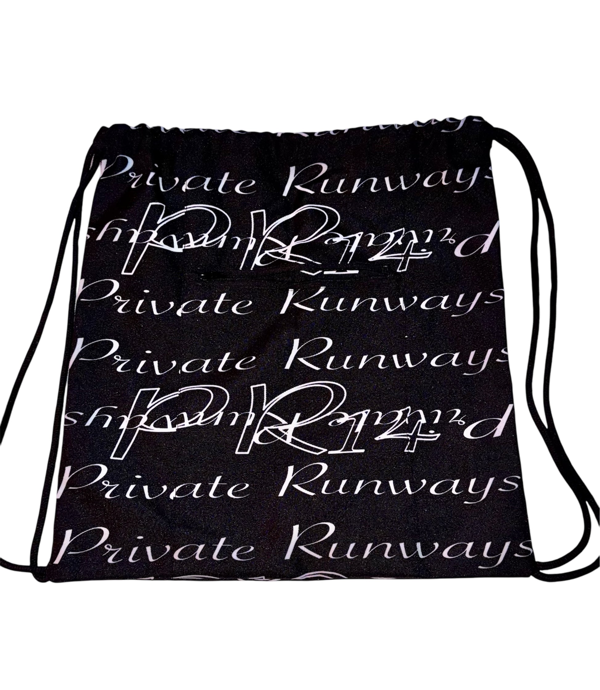 This sleek and stylish drawstring bag from Private Runways features a striking all-black background covered with elegant white script that reads “Private Runways.” Overlaid across the design are bold white PR14 logos that add a graphic, high-fashion edge to the classic print.