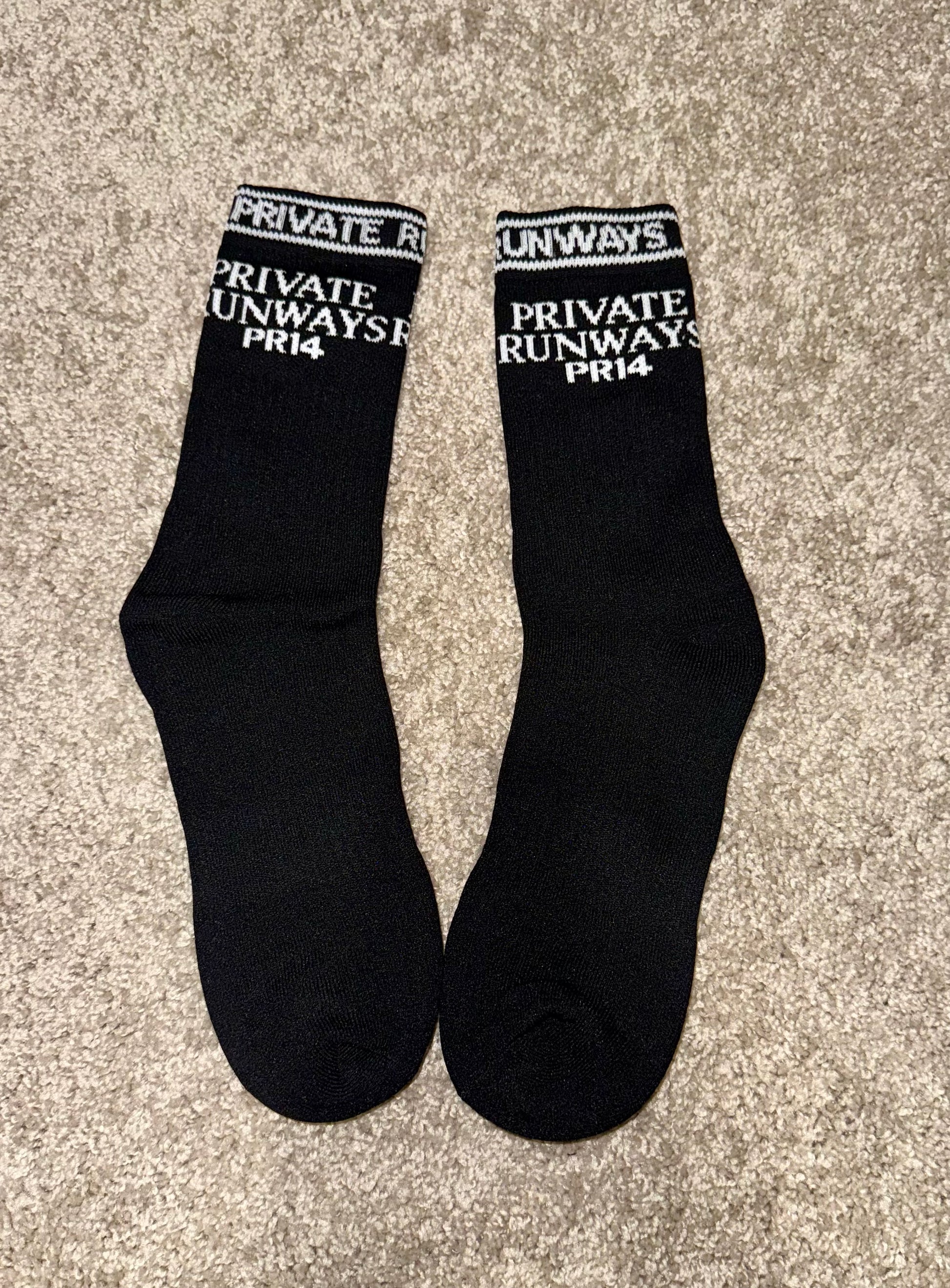 Elevate your essentials with the Private Runways PR14 Signature Band Socks in classic black. These crew socks feature bold double branding — PRIVATE RUNWAYS PR14 knit into the upper cuff and repeating around the band — giving them a premium designer look with unmistakable presence. Designed for everyday wear with a fashion-forward edge, these socks offer soft stretch comfort and a secure fit.